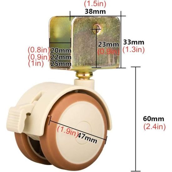 Spécifications: Matériau : MPA Couleur: Orange Poids net : 120 g x 4 pièces. 【360°Rotation】 Les roulettes peuvent être tournées à n'importe quel angle de 360 degrés, ce qui peut vous aider à effectuer le travail de déplacement plus facilement et sans effort, vous permettant d'effectuer le travail plus efficacement. 【Matériau résistant à l'usure】Le jeu de quatre roulettes pivotantes sont en nylon modifié de haute qualité et sont fabriquées avec précision. 【Conception Intelligente】La conception fixe à 5 trous et le support de plaque en forme de L peuvent mieux répartir le poids porteur et fournir un meilleur support fixe. 【Large Application】Les roulettes pivotantes et les roues peuvent être largement utilisées à l'intérieur et à l'extérieur en raison de leurs caractéristiques de haute résistance et de résistance aux intempéries. Dans le même temps, il peut efficacement imperméabiliser, imperméable à l'huile, anticorrosion, antirouille, rendant le produit plus durable. Roulettes Pivotantes, Roulettes De Meubles 360° Roulette Charge Lourde Couleur. Orange · Marque. Zocipro · Matériau. Nylon · Diamètre de roue. 37 Millimètres · Poids de l'article. 120 Grammes · Type de fixation. Montage sur plaque Elles sont très appropriées pour une variété d'objectifs allant du bricolage aux applications industrielles, aux maisons, aux bureaux, aux écoles, aux magasins et aux hôpitaux, etc. Roulettes pivotantes Charge Lourde de 4 Pouces, roulettes de Portail à... L'installation professionnelle est fortement recommandée! Parfait pour déplacer les petits équipements et les petits meubles, y compris pouf, table basse, siège, étagère, supports de plantes, étagères, poubelles à jouets, chariots à courses, établi, etc. Les roulettes avec vis peuvent être facilement installées. Si vous avez des questions, n'hésitez pas à nous contacter. Roulette Pivotante Avec Frein Zocipro 8PCS Roulettes Pivotantes Avec Ecrou Et Clé, PU Roulette Charge Lourde Caoutchouc Pour Roulettes Pour Meubles